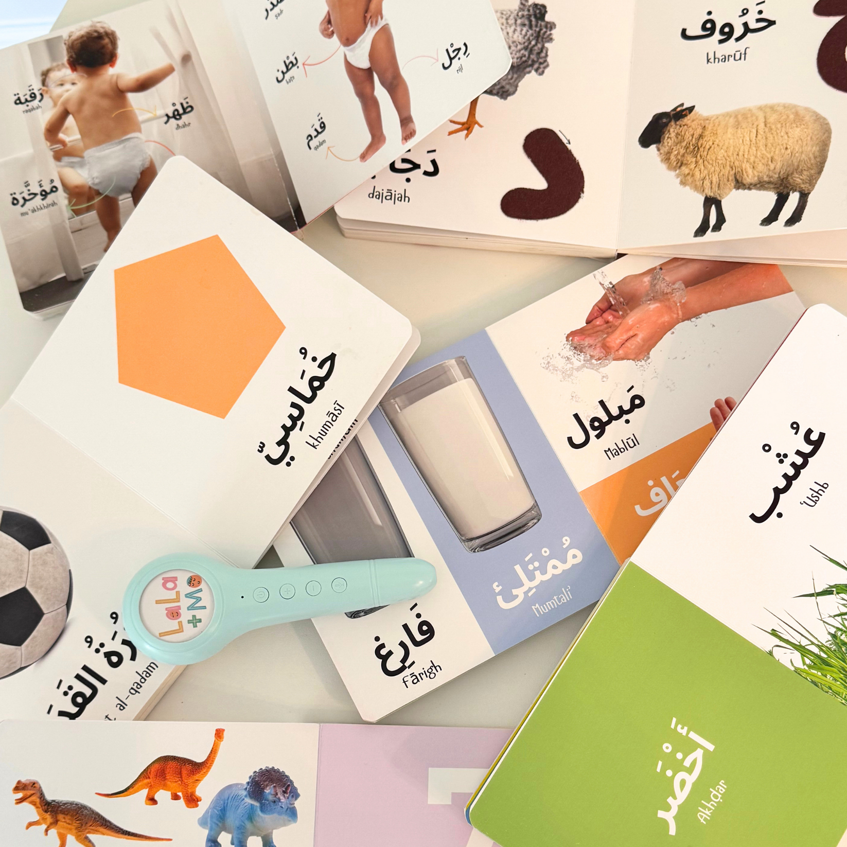 Each book features real-life photographs with clear, simple backgrounds, following a Montessori approach that encourages focus and connection. With the Ilm-Pen, children can tap on each word to hear its Arabic pronunciation, English translation, and even fun sound effects for select entries like animals, vehicles, and more.