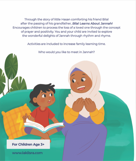 Through the story of little Hasan comforting his friend Bilal after the passing of his grandfather, Bilal Learns About Jannah!