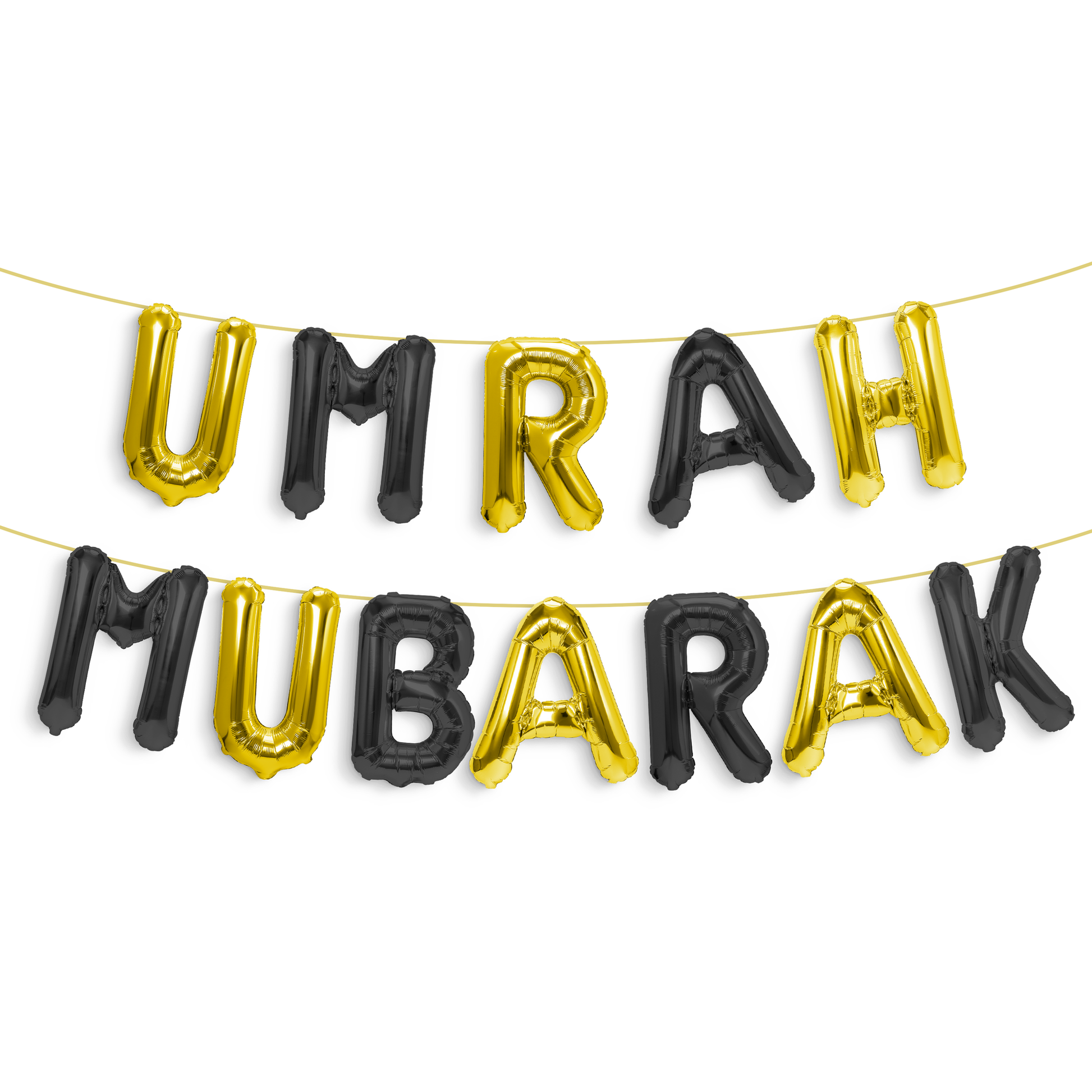 Welcome your loved ones back from their blessed Umrah journey with this elegant set of gold and black foil balloons. The set includes 12 balloons spelling out 'Umrah Mubarak', each inflating up to 16 inches, perfect for creating a celebratory atmosphere at home or parties.
