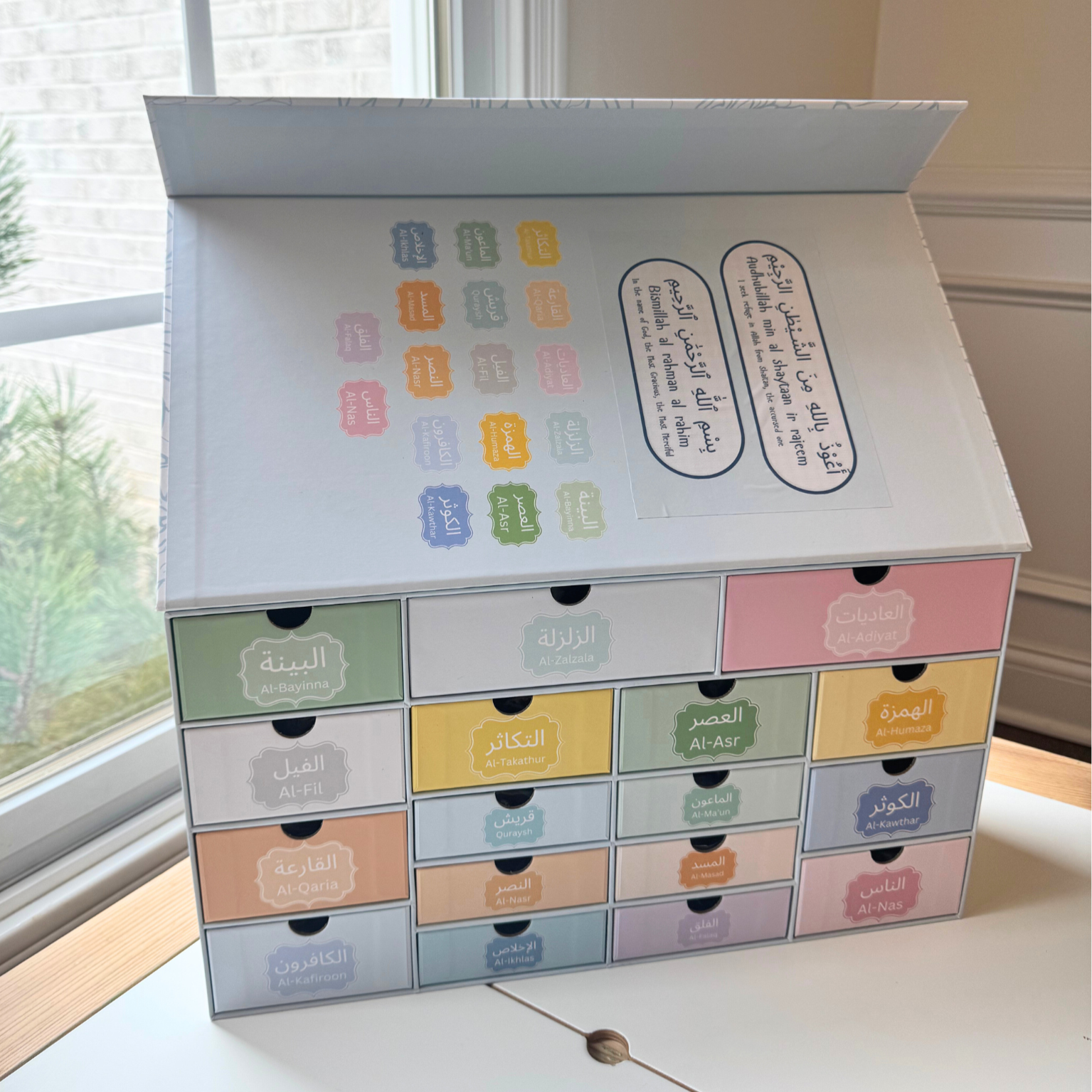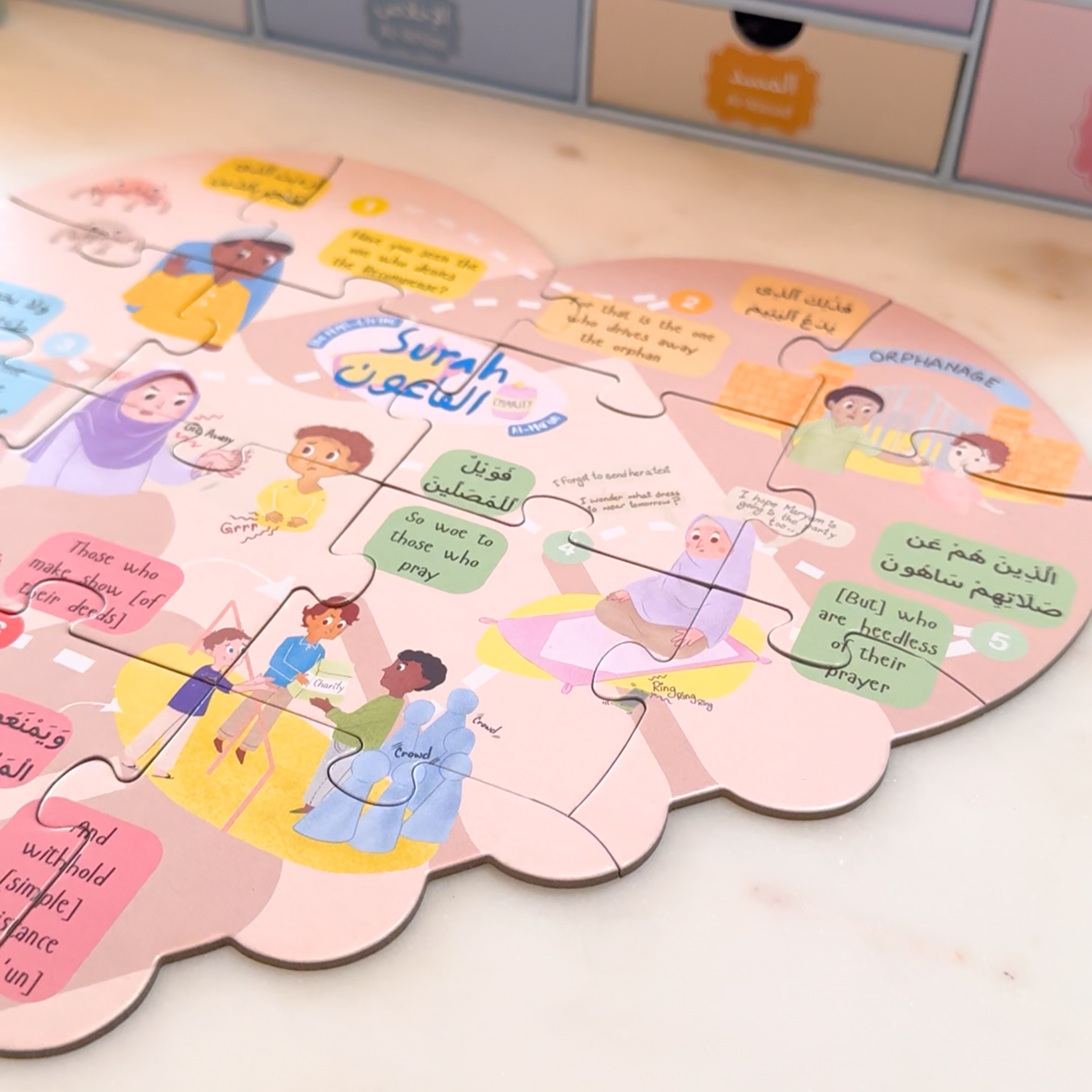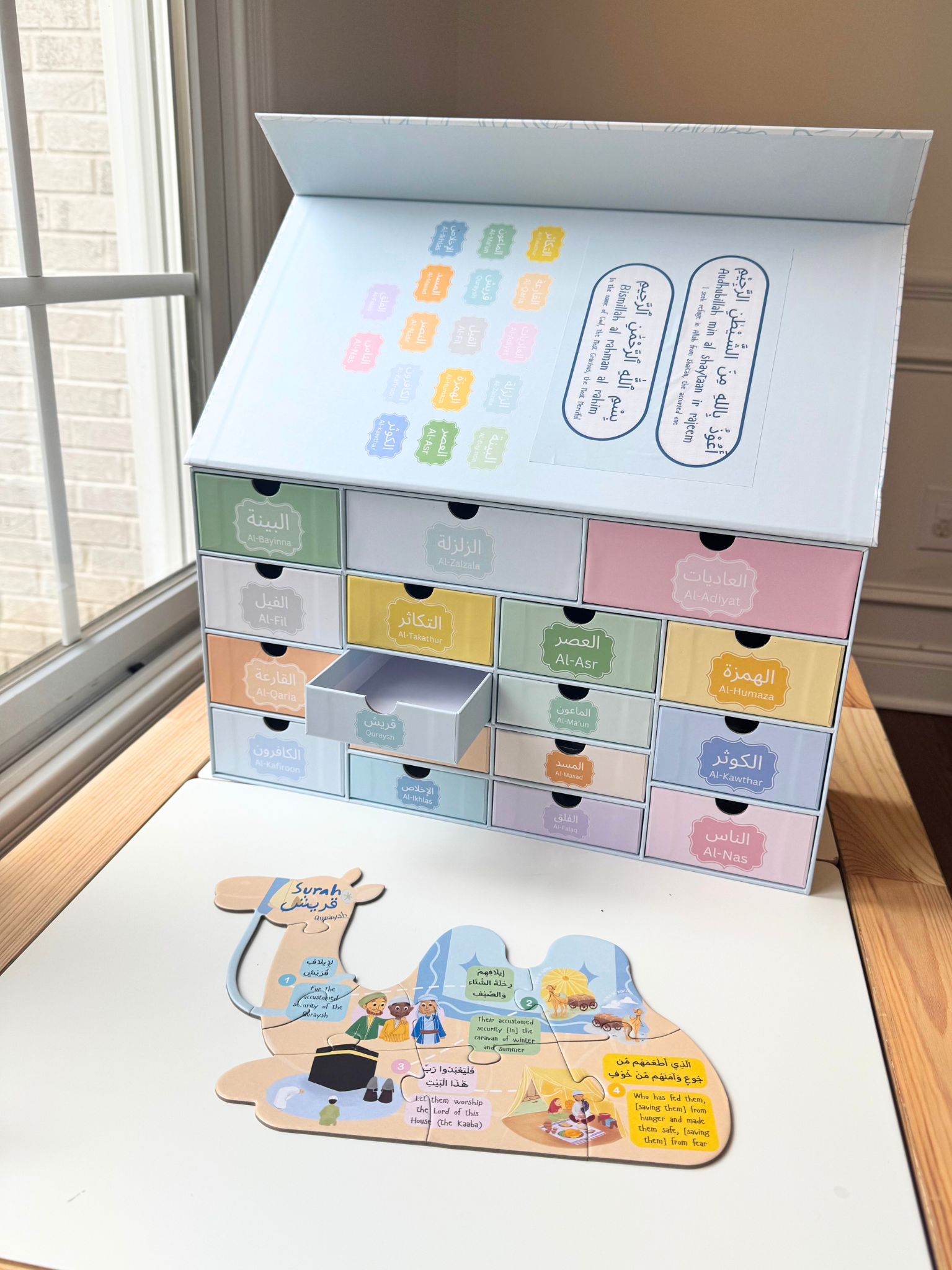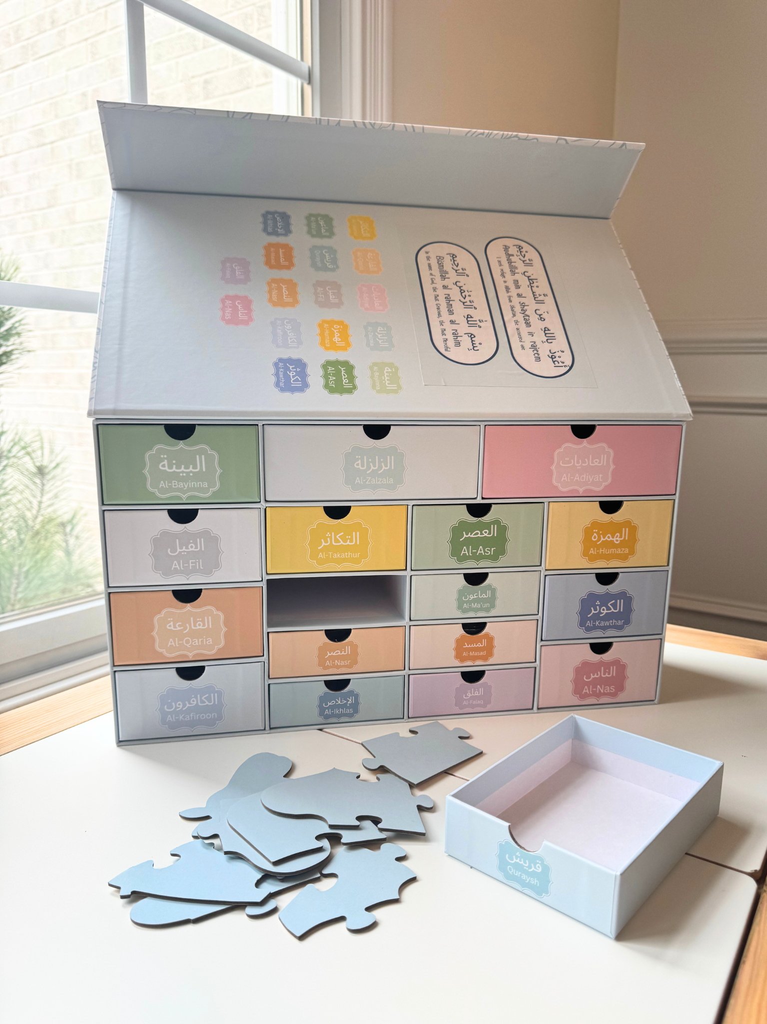 Introduce your little ones to Juzu’ Amma with this unique puzzle set! Featuring 17 Surahs from Al-Bayinna to An-Nas, this set combines learning Quran with engaging play, tailored to suit all types of learners: