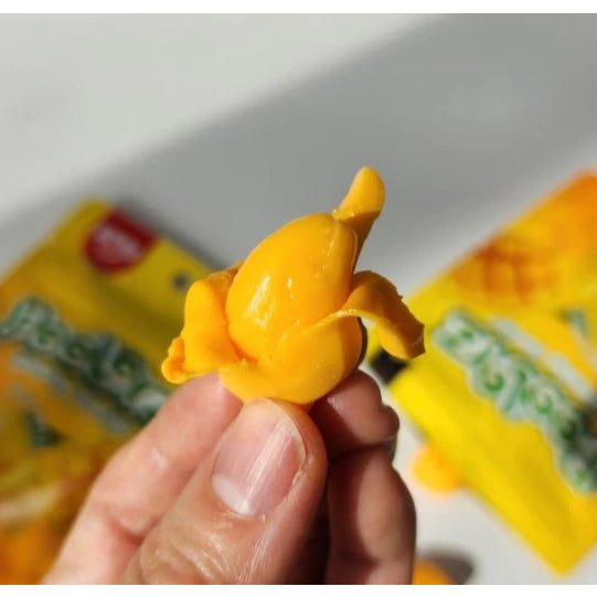 Ingredients: Maltose Syrup (From Corn)(52%), Sugar (33%), Concentrated apple juice (4.5%), Gelatin (Beef)(3.2%), Mango Jam, Humectant E420 (Sorbitol Syrup), Acidity Regulators E330 (Citric Acid), Acidity Regulators E296 (Malic Acid), Acidity Regulators E331 (Sodium citrate), Carrageenan, Maltodextrin, Humectant E422 (Glycerol), Artificial flavour, Thickener E440 (Pectin), Glazing Agent E903 Carnauba Wax), Artificial colours E171 (Titanium dioxide), E102* (Tartrazine), E110* (Sunset yellow FCF).